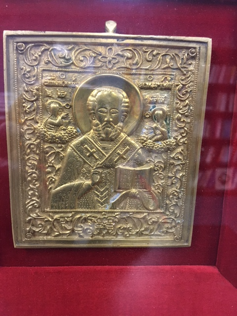 Encased 19th Century brass icon of St. Nicholas. The size of the icon is 4 1/8" high by 3 5/8" wide. The brass frame with matted velvet backing is 9 1/2" high by 9" wide.